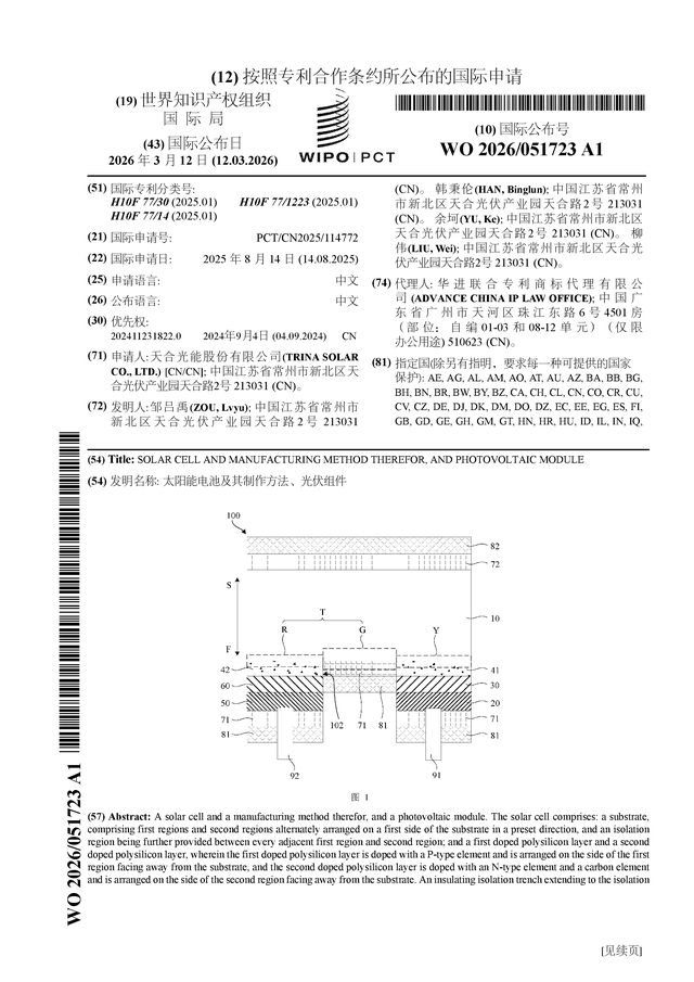 天合光能公布国际专利申请:“太阳能电池及其制作方法、光伏组件”