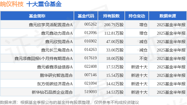 根据2025基金半年报公募基金重仓股数据,重仓该股的公募基金共9家,其中持有数量最多的公募基金为鑫元基金的鑫元欣享灵活配置混合A。鑫元欣享灵活配置混合A目前规模为3.16亿元,最新净值1.3188(10月14日),较上一交易日下跌3.11%,近一年上涨32.8%。该公募基金现任基金经理为李彪。李彪在任的基金产品包括:鑫元安鑫回报混合A,管理时间为2021年3月25日至今,期间收益率为25.9%;鑫元鑫动力混合A,管理时间为2021年7月13日至今,期间收益率为-1.09%;鑫元长三角混合A,管理时间为2022年3月30日至今,期间收益率为13.59%。