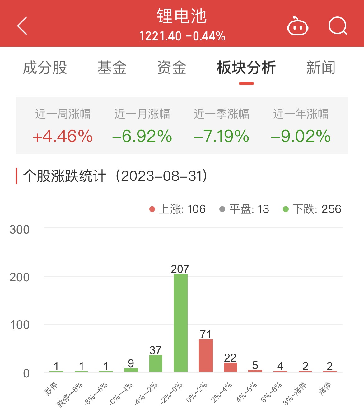 中国经济网北京8月31日讯今日,锂电池板块整体涨幅-0.44%,其中106只股票上涨,13只股票平盘,256只股票下跌。