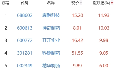 其中,康鹏科技、神奇制药、开开实业、科源制药、精华制药位列板块涨幅前五位,涨幅分别为11.93%、10.03%、9.98%、9.05%、6.00%。