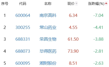 南京高科、常山药业、荣昌生物、毕得医药、湘财股份位列涨幅榜后五位,涨幅分别为-7.04%、-4.41%、-3.88%、-2.81%、-2.63%。