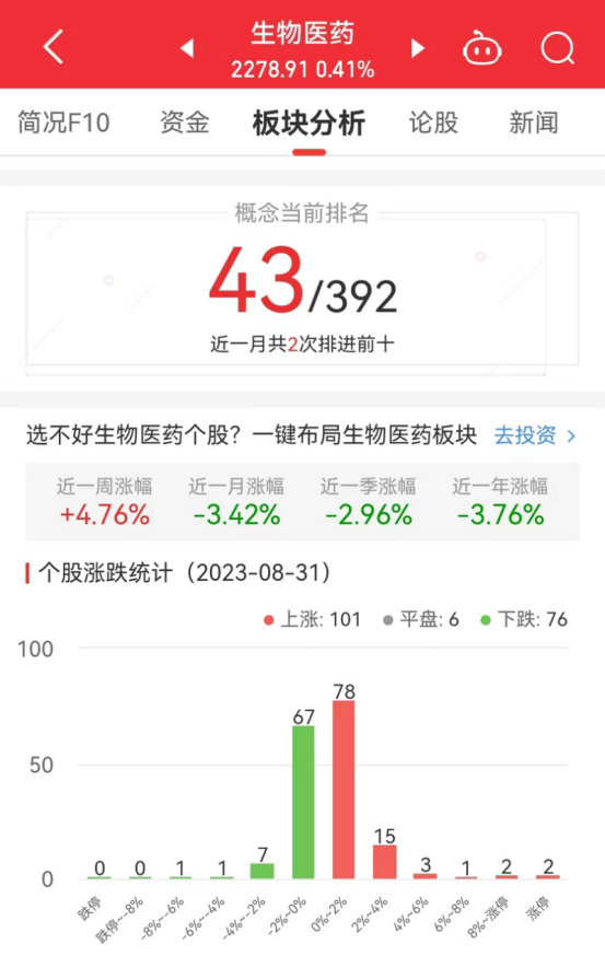 中国经济网北京8月31日讯今日,生物医药板块整体涨幅0.41%,其中101只股票上涨,6只股票平盘,76只股票下跌。