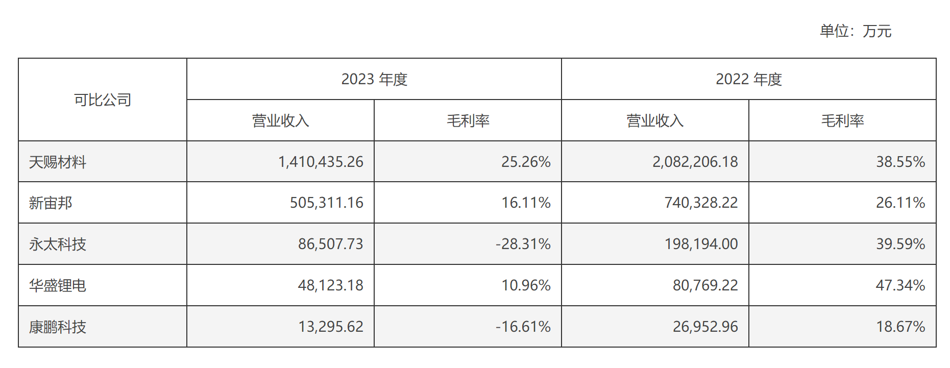 如上图所示,天赐材料“锂离子电池材料”毛利率从2022年的38.55%下降至2023年的25.26%。