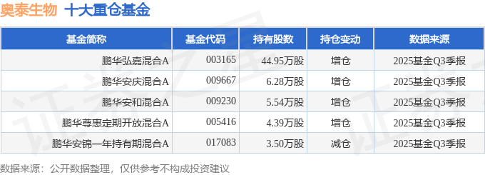 持有奥泰生物最多的基金为鹏华弘嘉混合A,目前规模为3.43亿元,最新净值2.8776(10月31日),较上一交易日上涨1.57%,近一年上涨38.67%。该基金现任基金经理为汤志彦。