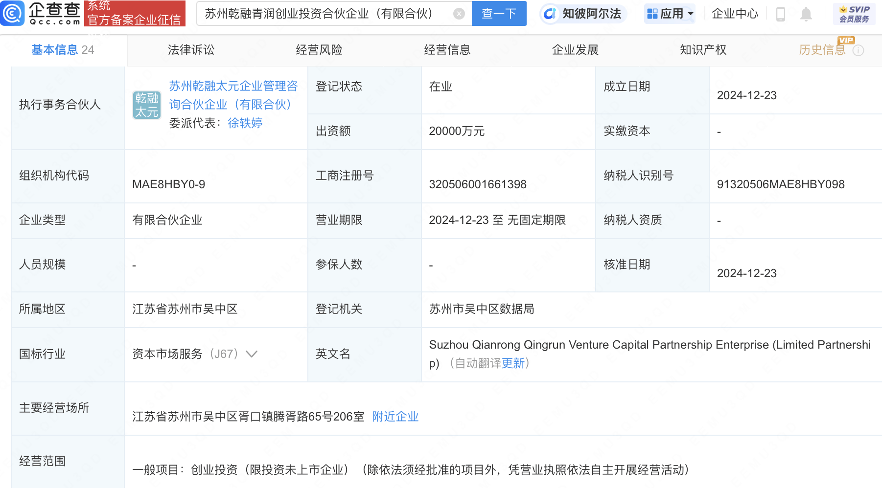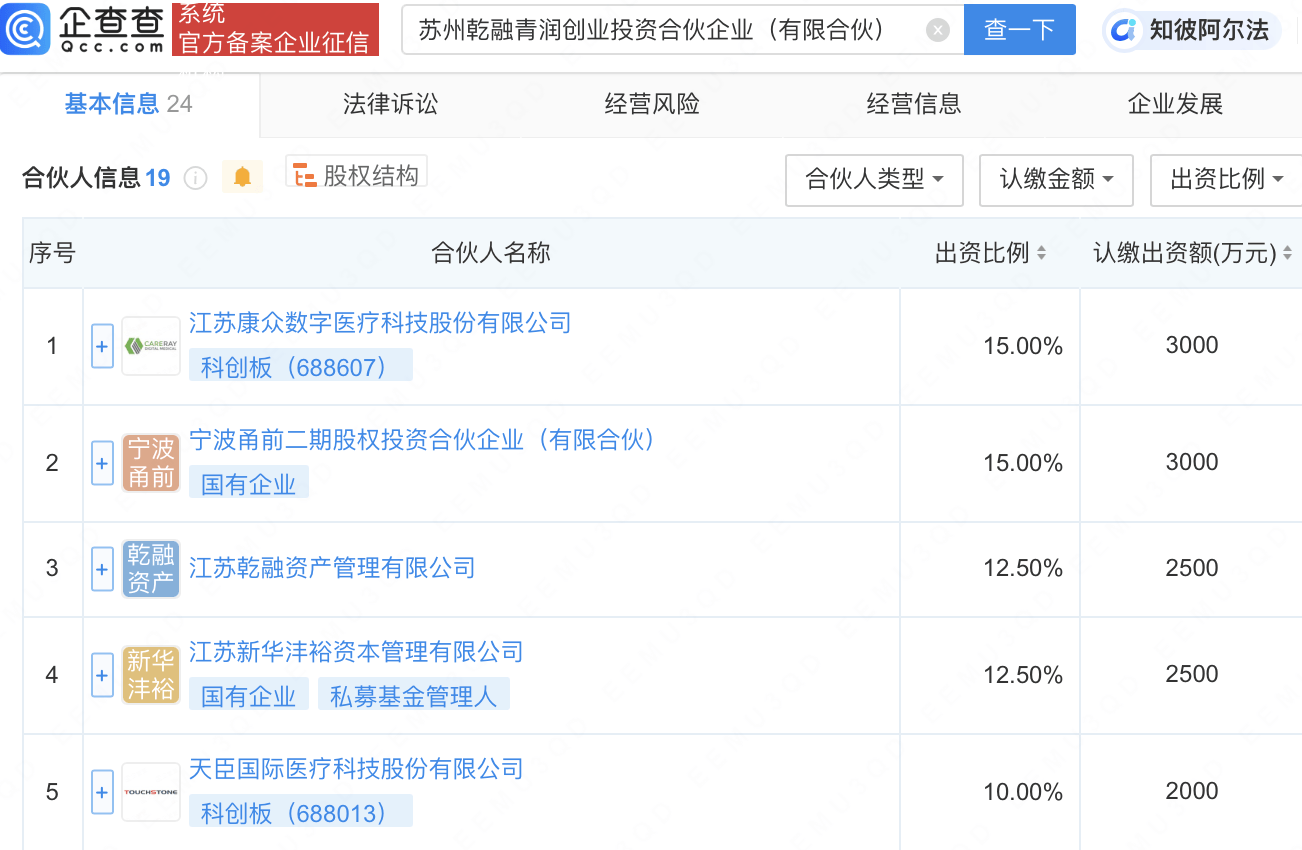 企查查APP显示,近日,苏州乾融青润创业投资合伙企业(有限合伙)成立,出资额2亿元人民币,经营范围包含:创业投资(限投资未上市企业)。企查查股权穿透显示,该企业由康众医疗(688607)、天臣医疗(688013)等共同持股。