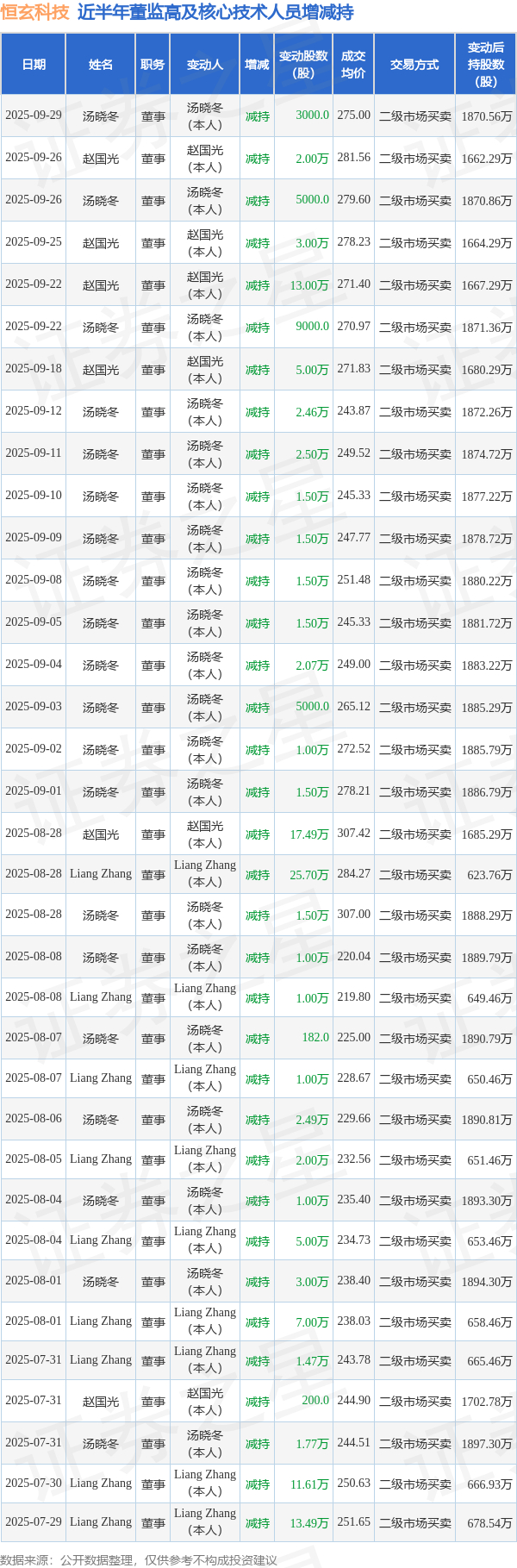恒玄科技:9月29日高管汤晓冬减持股份合计3000股