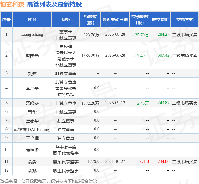 恒玄科技近半年内的董监高及核心技术人员增减持详情如下: