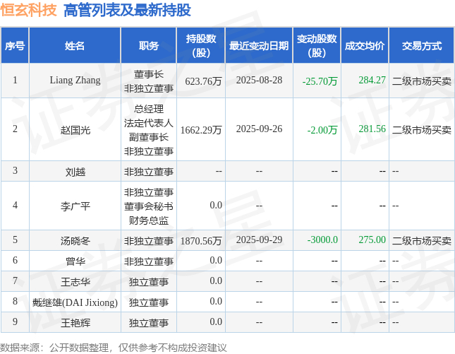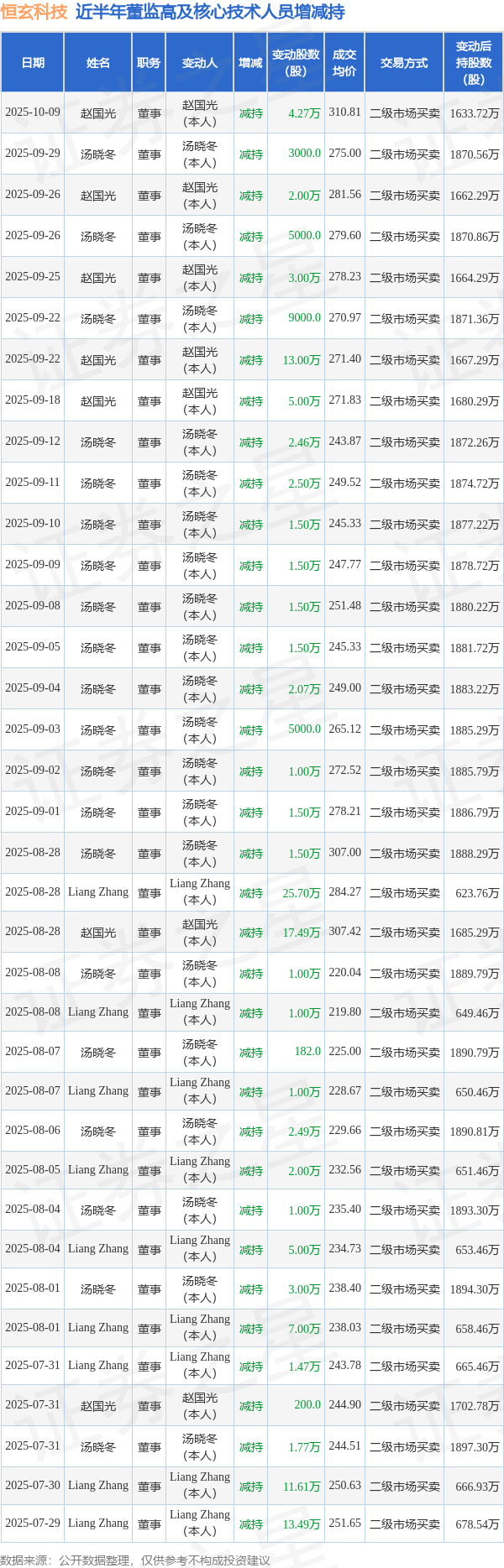 恒玄科技近半年内的董监高及核心技术人员增减持详情如下: