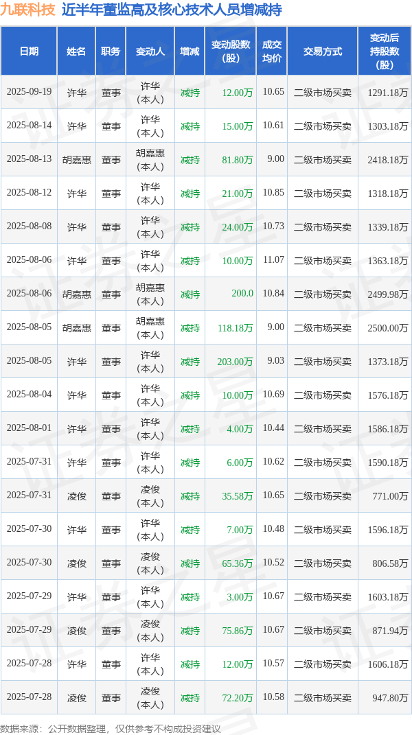 九联科技近半年内的董监高及核心技术人员增减持详情如下: