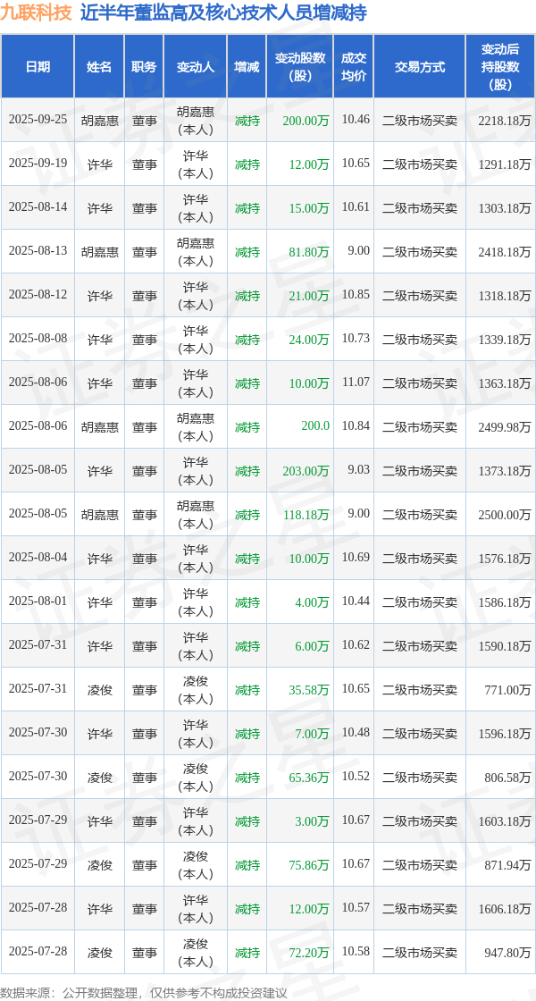 九联科技近半年内的董监高及核心技术人员增减持详情如下:
