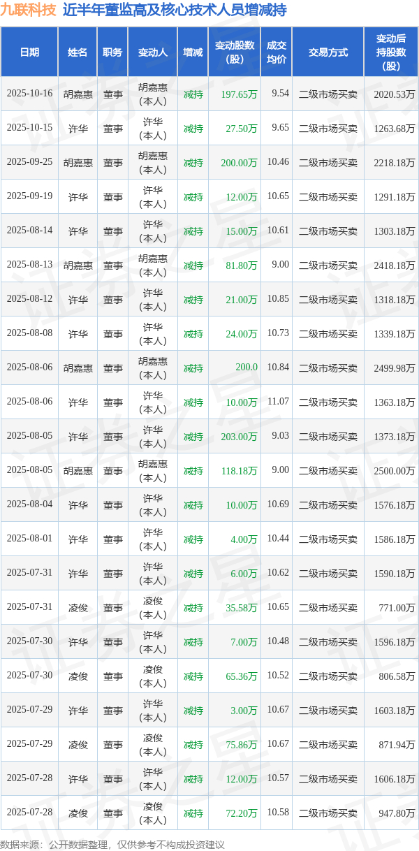 九联科技近半年内的董监高及核心技术人员增减持详情如下: