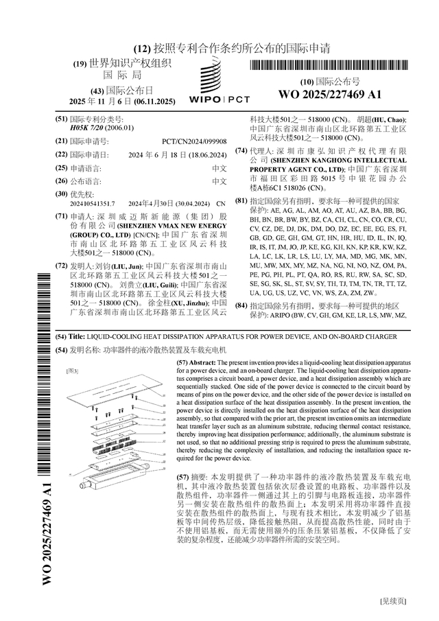 威迈斯公布国际专利申请:“功率器件的液冷散热装置及车载充电机”