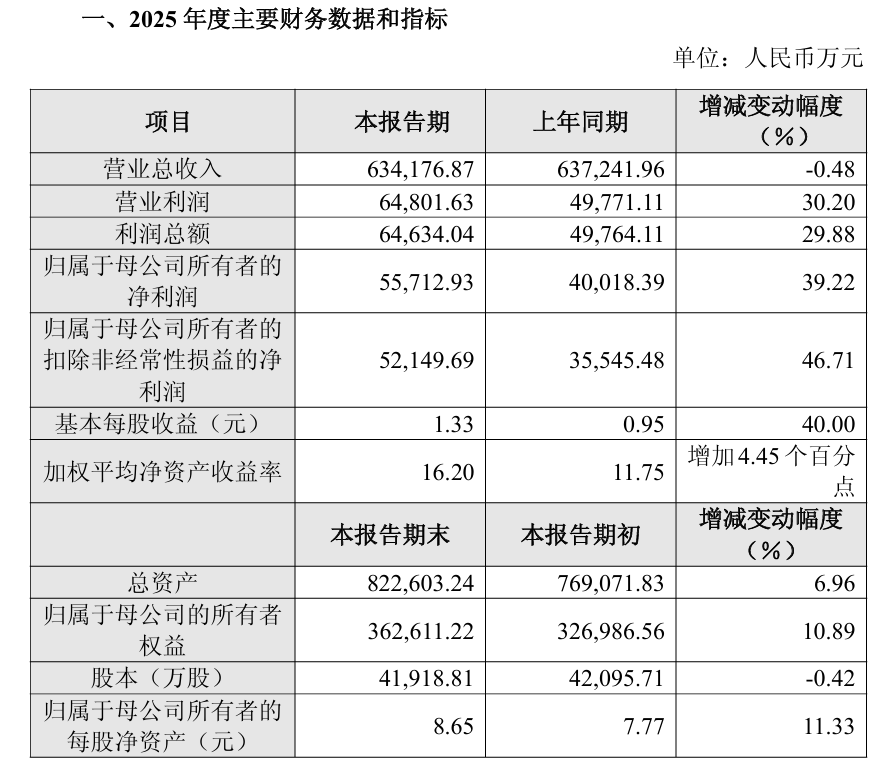 公司全年营业总收入63.42亿元,同比减少0.48%;归属于上市公司股东的净利润5.57亿元,同比增长39.22%;基本每股收益1.33元,同比增长40%。
