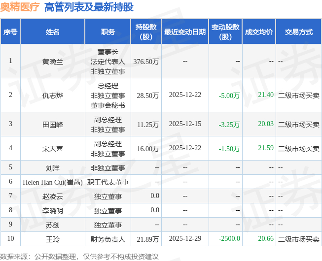 奥精医疗:12月29日高管王玲减持股份合计2500股