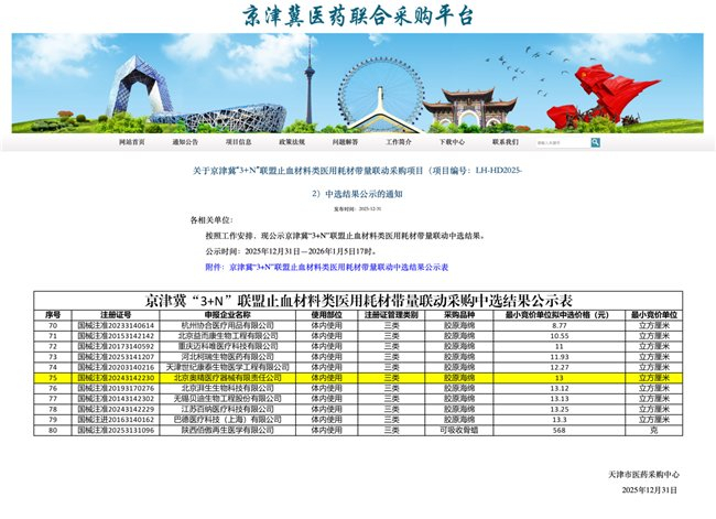 奥精医疗胶原蛋白止血海绵中选京津冀“3+N”联盟带量采购