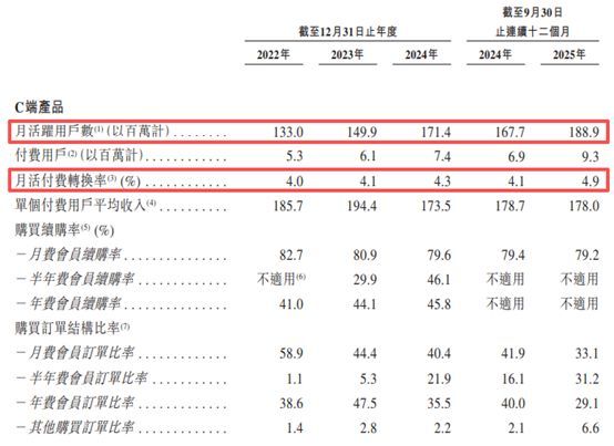 此外,虽然报告期内合合信息的月活跃用户持续增长,但对应的月活付费转换率均不到5%。截至今年三季度末,公司的月活用户数为1.889亿,但付费用户转换率仅4.9%(约926万),这意味着其绝大多数用户仍为免费用户。