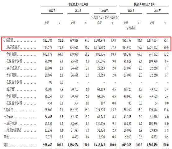 2022年、2023年、2024年和2025年前三季度(以下简称“报告期”),合合信息的主要收入来自C端产品,收入占比分别为82.2%、84.3%、83.8%和85.7%。而C端产品中,收入则主要来自扫描全能王,其总收入占比分别为72.3%、76.2%、77.3%和80.6%,呈逐年/期上升趋势。公司在招股书中明确提及:“于不久的将来,扫描全能王的销售额可能会继续占我们销售总额的很大部分。”