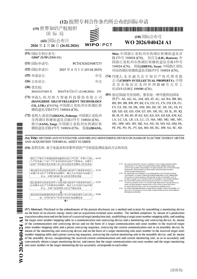 西力科技公布国际专利申请:“基于电能表和采集终端资产号组装监测设备的方法和系统”
