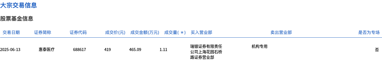 惠泰医疗今日大宗交易平价成交1.11万股,成交额465.09万元