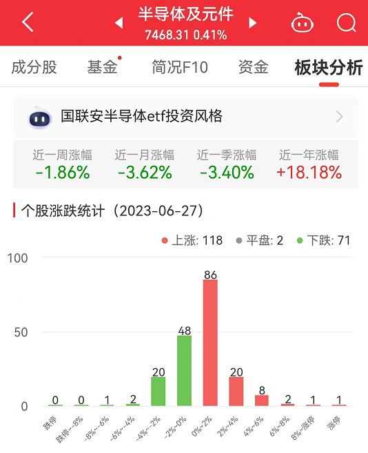 中国经济网北京6月27日讯 今日,半导体及元件板块整体涨幅0.41%,其中,118只股票上涨,2只股票平盘,71只股票下跌。