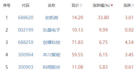 其中,安凯微、东晶电子、创耀科技、本川智能、科翔股份位列板块涨幅前五位,涨幅分别为33.80%、9.99%、6.75%、6.15%、5.83%。