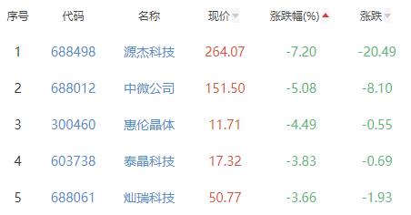 源杰科技、中微公司、惠伦晶体、泰晶科技、灿瑞科技位列涨幅榜后五位,涨幅分别为-7.20%、-5.08%、-4.49%、-3.83%、-3.66%。