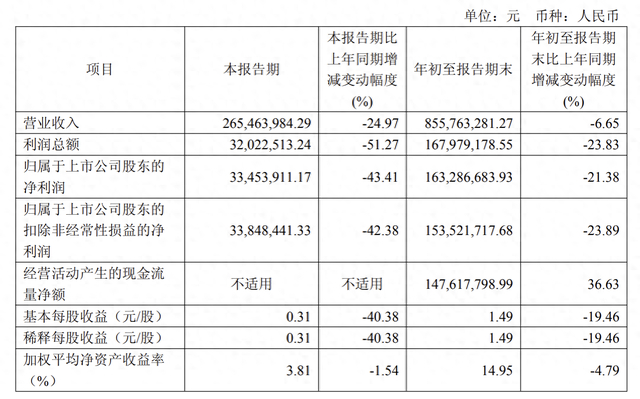 “降本”“增效”已成为阳光诺和当前运营的关键词。继2024年营收净利双降、2025年上半年增收不增利后,阳光诺和第三季度业绩持续恶化,当期营业收入达2.65亿元,同比降24.97%,归母净利润为3345.39万元,同比降43.41%,扣非归母净利润为3384.84万元,同比下降42.38%。