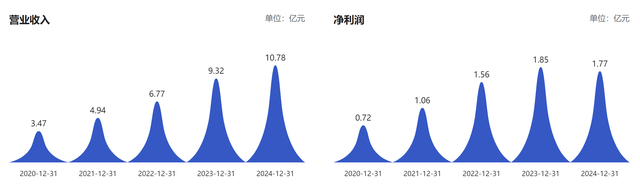 2020年-2023年,其营收分别为3.47亿元、4.94亿元、6.77亿元、9.32亿元,同期净利分别为0.72亿元、1.06亿元、1.56亿元、1.85亿元,这期间营收与净利润均保持两位数增长。