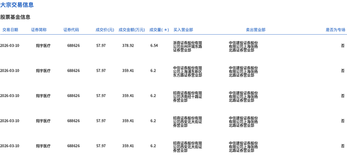 3月10日,翔宇医疗大宗交易成交31.34万股,成交额1816.56万元,占当日总成交额的9.76%,成交价57.97元,较市场收盘价65.33元折价11.27%。