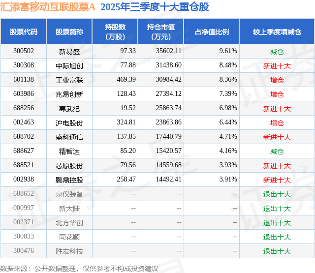 根据2025基金Q3季报公募基金重仓股数据,重仓该股的公募基金共38家,其中持有数量最多的公募基金为汇添富基金的汇添富移动互联股票A。汇添富移动互联股票A目前规模为32.01亿元,最新净值2.821(1月6日),较上一交易日上涨0.14%,近一年上涨98.52%。该公募基金现任基金经理为沈若雨。沈若雨在任的基金产品包括:汇添富创新活力混合A,管理时间为2021年1月12日至今,期间收益率为13.92%;汇添富互联网核心资产六个月持有混合A,管理时间为2021年9月15日至今,期间收益率为33.69%;汇添富ESG可持续成长股票A,管理时间为2023年12月28日至今,期间收益率为102.31%;