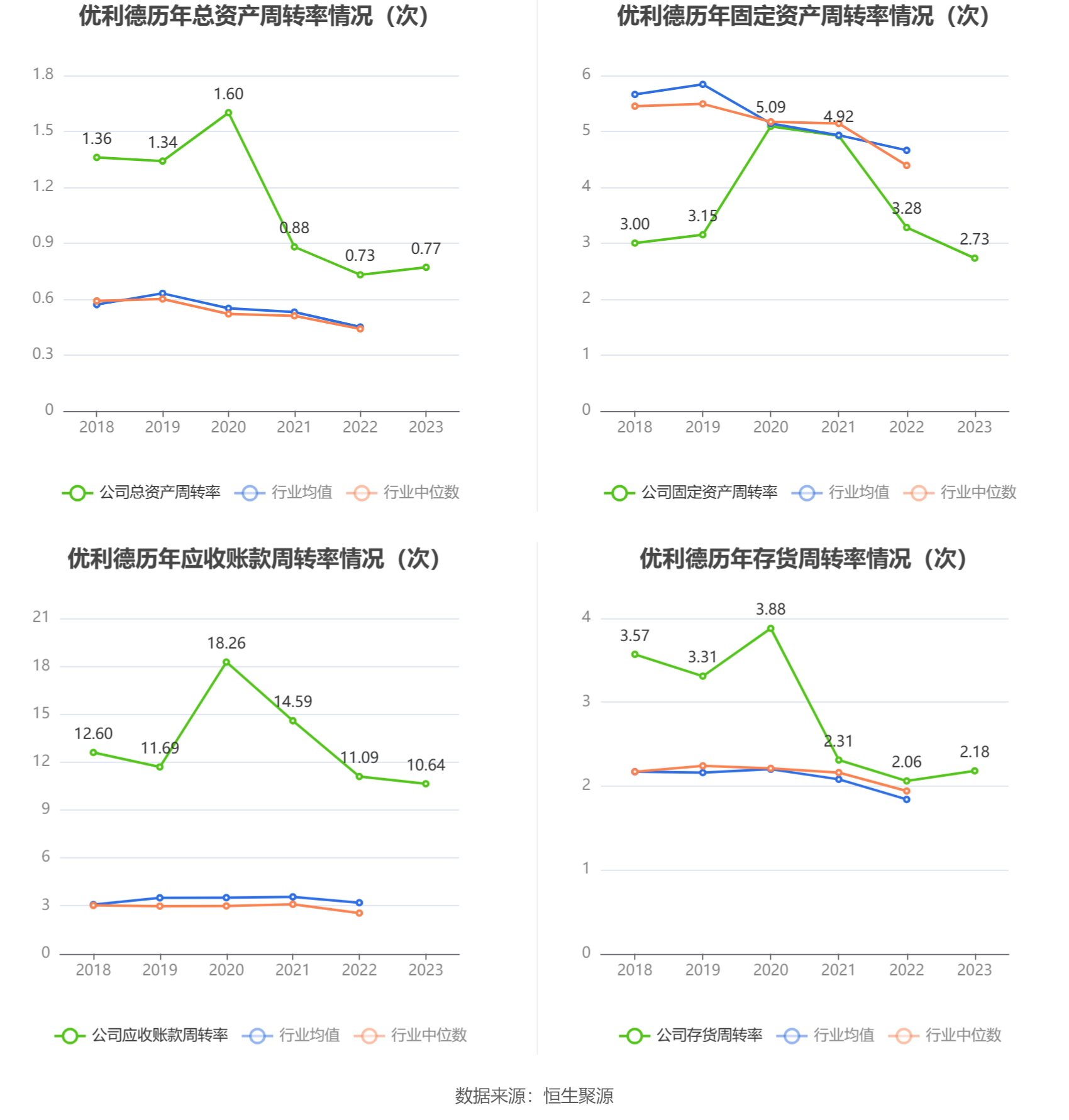 营运能力方面,2023年,公司公司总资产周转率为0.77次,上年同期为0.73次(2022年行业平均值为0.45次,公司位居同行业8/58);固定资产周转率为2.73次,上年同期为3.28次(2022年行业平均值为4.66次,公司位居同行业38/58);公司应收账款周转率、存货周转率分别为10.64次、2.18次。