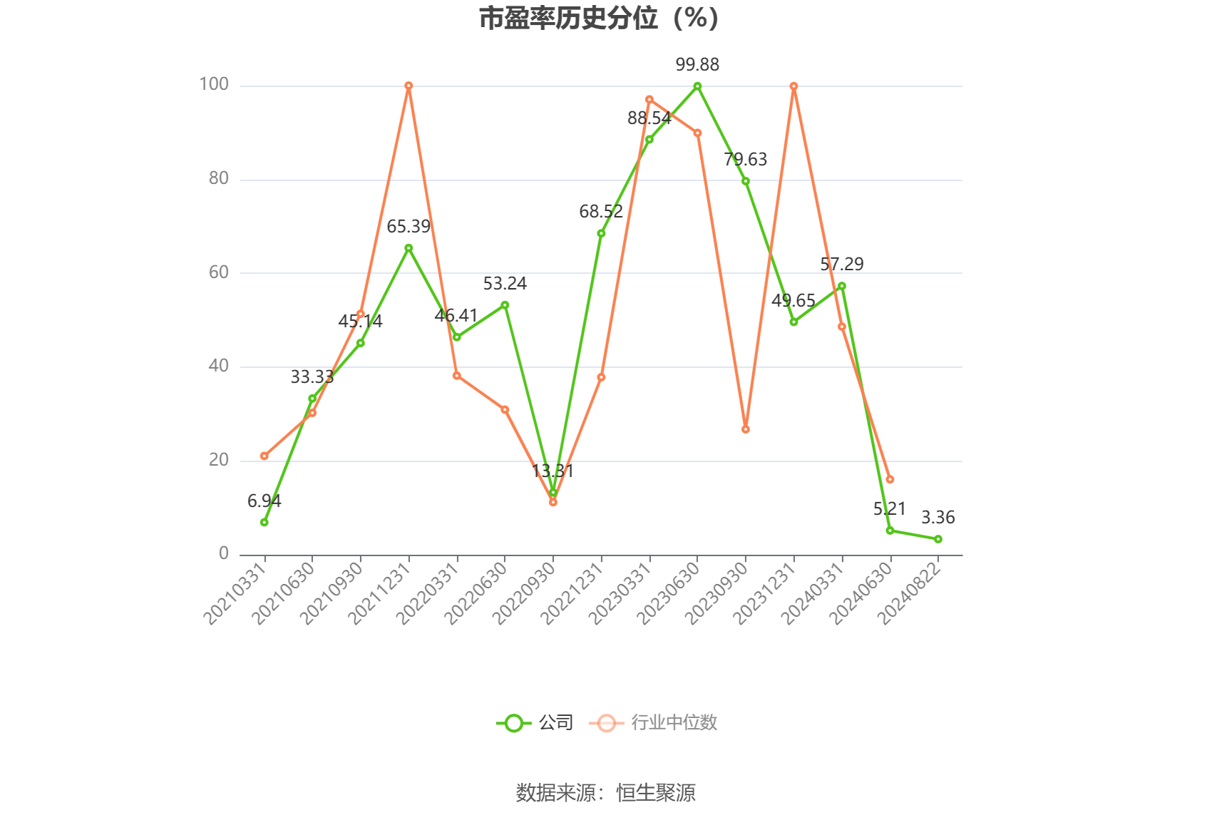 市盈率为负时,不显示当期分位数,会导致折线图中断。