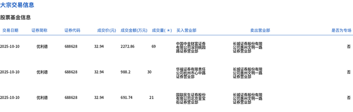 10月10日,优利德大宗交易成交120万股,成交额3952.8万元,占当日总成交额的41.53%,成交价32.94元,较市场收盘价35.3元折价6.69%。
