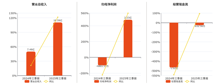 公司营业总收入为16.59亿元,较去年同报告期营业总收入增加9.10亿元,实现2年连续上涨,同比较去年同期上涨121.47%。归母净利润为2.23亿元,较去年同报告期归母净利润增加2.72亿元。经营活动现金净流入为-632.56万元,较去年同报告期经营活动现金净流入增加9523.14万元。