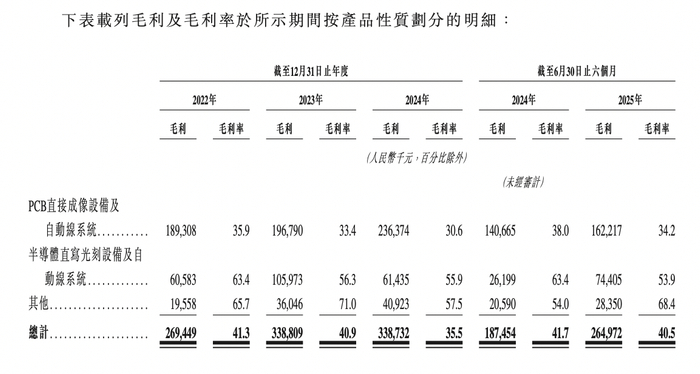 另外,2022年-2024年,芯碁微装的毛利率分别为41.3%、40.9%、35.5%,逐年走低。2025上半年,芯碁微装的毛利率为40.5%,同比下滑1.2个百分点。