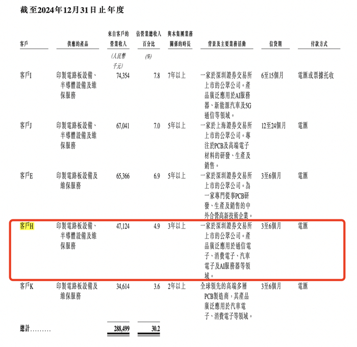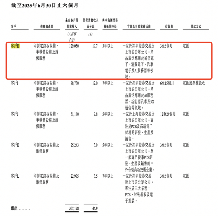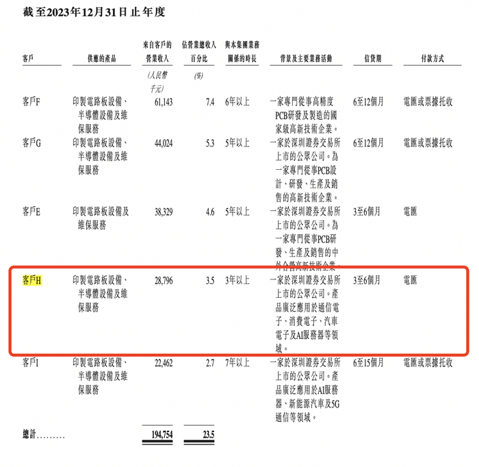 招股书中透露,客户H是一家于深圳证券交易所上市的公司。产品广泛应用于通信电子、消费电子、汽车电子及AI服务器等领域。