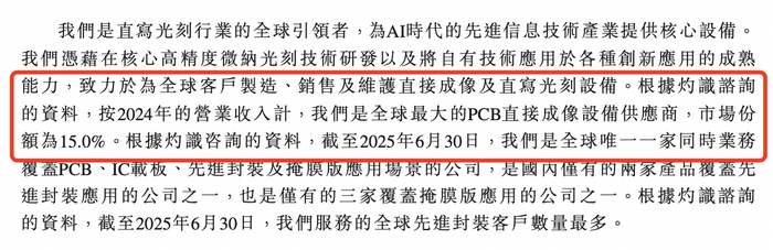 根据灼识谘询的资料,按2024年的营业收入计,公司是全球最大的PCB直接成像设备供应商,市场份额为15%。