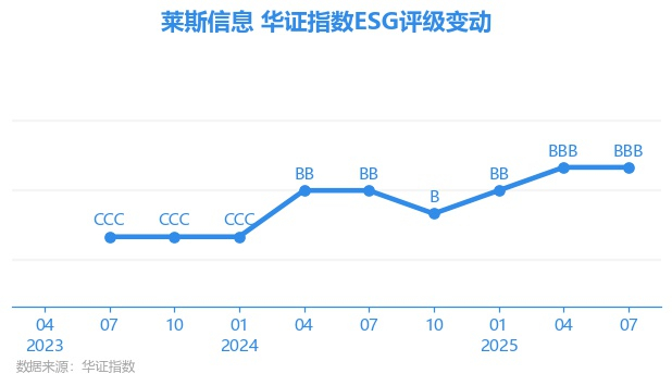日前,华证指数公布了新一期(2025年7月31日)的ESG评级结果,莱斯信息(688631.SH)获得BBB评级(华证指数评级为C起至AAA九档,C为最低档,AAA为其最高一级评级/AA为其第二档),上一期(2025年4月30日)ESG评级为BBB。本期ESG评级在156家软件行业A股上市公司中排名第25(上一期排名第21)。