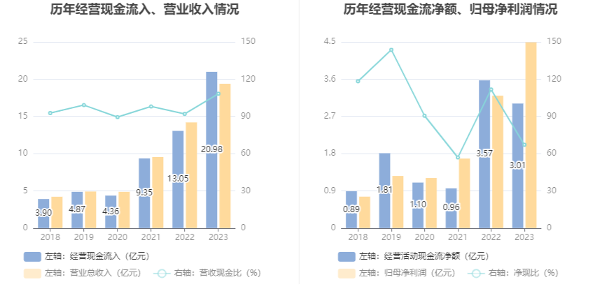 2023年,公司营业收入现金比为108.23%,净现比为67.12%。