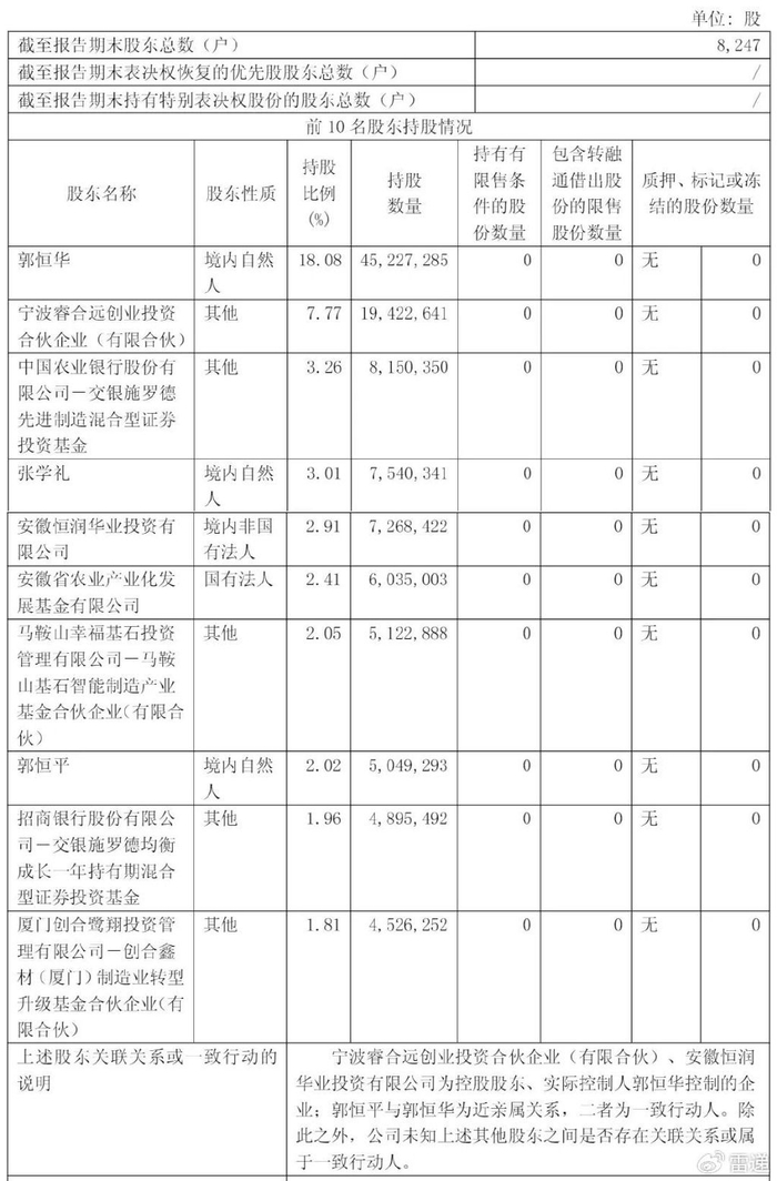 IPO前,郭恒华持股为18.08%,宁波睿合远创业投资合伙企业(有限合伙)持股为7.77%,中国农业银行股份有限公司-交银施罗德先进制造混合型证券投资基金持股为3.26%,张学礼持股为3.01%,安徽恒润华业投资有限公司持股为2.91%;