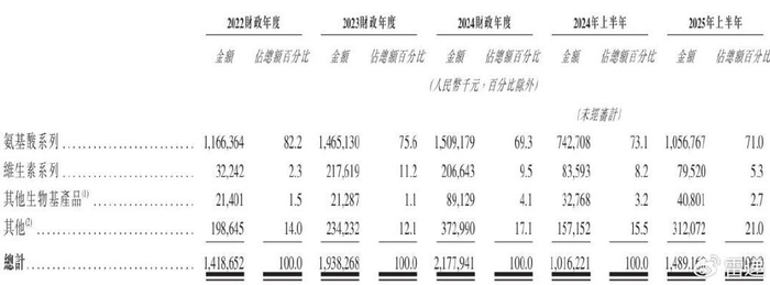 华恒生物2025年上半年来自氨基酸系列收入为10.57亿元,占比为71%;来自维生素系列收入为7952万元,占比为5.3%;其他生物基产品收入为4080万元,占比为2.7%;其他收入为3.12亿元,占比为21%。