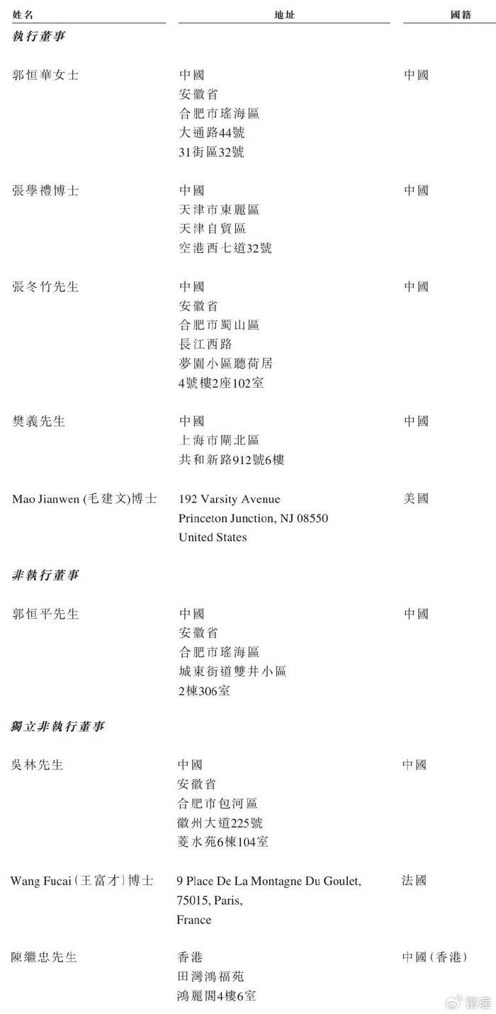 华恒生物执行董事分别为郭恒华女士、张学礼博士、张冬竹、樊义、Mao Jianwen (毛建文)博士;非执行董事为郭恒平,独立非执行董事分别为吴林、Wang Fucai(王富才)博士、陈继忠。