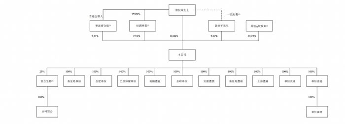 截至最后实际可行日期,华恒生物股权由郭恒华控制约18.08%,宁波睿合远(由郭恒华以其普通合伙人身份控制)控制约7.77%,恒润华业(由郭恒华控制并拥有99%)控制约2.91%,及郭恒平控制约2.02%。