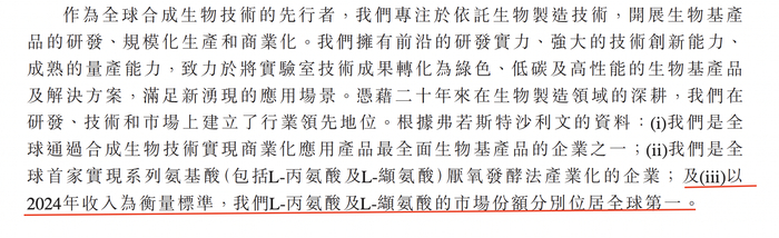 根据弗若斯特沙利文的资料:华恒生物是全球通过合成生物技术实现商业化应用产品最全面生物基产品的企业之一;公司是全球首家实现系列氨基酸(包括L-丙氨酸及L-缬氨酸)厌氧发酵法产业化的企业;及以2024年收入为衡量标准,公司L-丙氨酸及L-缬氨酸的市场份额分别位居全球第一。