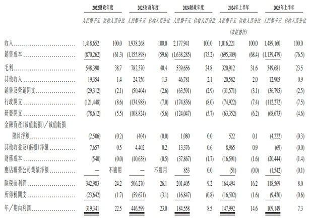 2022年、2024年及2025年上半年,公司最大客户A是一家德国企业,向其销售金额分别为2.18亿元、2.56亿元及1.38亿元,占比15.4%、11.8%及9.3%。