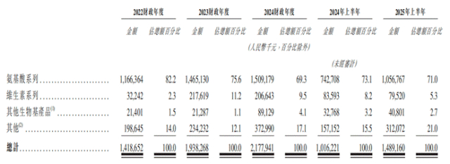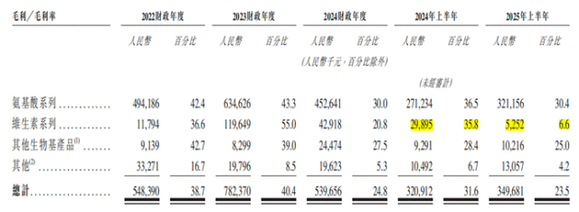 2025年上半年,维生素产品毛利率仅有6.6%,同比减少29.2个百分点;氨基酸产品毛利率为30.4%,同比下降6.1个百分点。