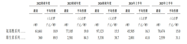 面对激烈的市场竞争,华恒生物不得不采取“以价换量”的策略。自2022年以来,公司维生素系列产品售价持续下跌,由2022年的8.95万元/吨降至2025年上半年的3.11万元/吨,降幅65.25%;同期,收入占比7成左右的氨基酸系列产品价格,也在波动中下跌了20.63%至1.5万元/吨。