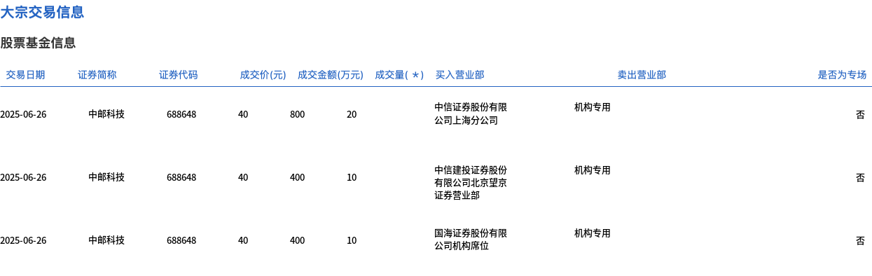 中邮科技今日大宗交易折价成交40万股,成交额1600万元