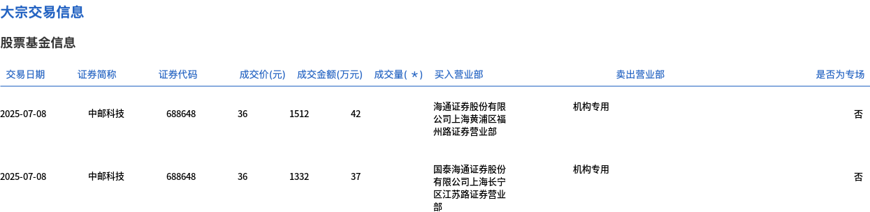 中邮科技今日大宗交易折价成交79万股,成交额2844万元