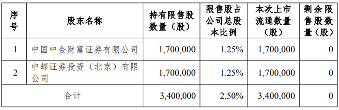 11月5日,中邮科技(688648)发布公告,本次将于2025年11月13日上市流通的限售股总数为340万股,占公司总股本的2.50%。这些限售股属于公司首次公开发行的战略配售股份,限售期为24个月,具体情况如下: